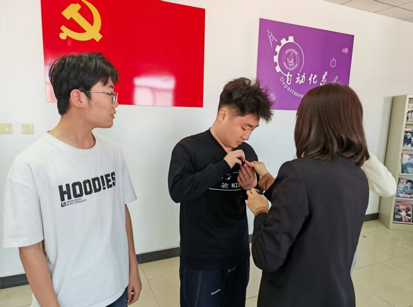 党委组织员季老师发言,她从入党介绍人和同学的评价中可以看出,3名同志在平时生活中十分突出的,希望同志们能够不忘初心,牢记党员身份,在以后的学习、工作当中,要更加严格要求自己,善于听取建议,争做合格党员。同时也为新发展的预备党员佩戴党徽,全体党员面向党旗庄严宣誓,掷地有声的誓词彰显着青年党员的初心与担当。