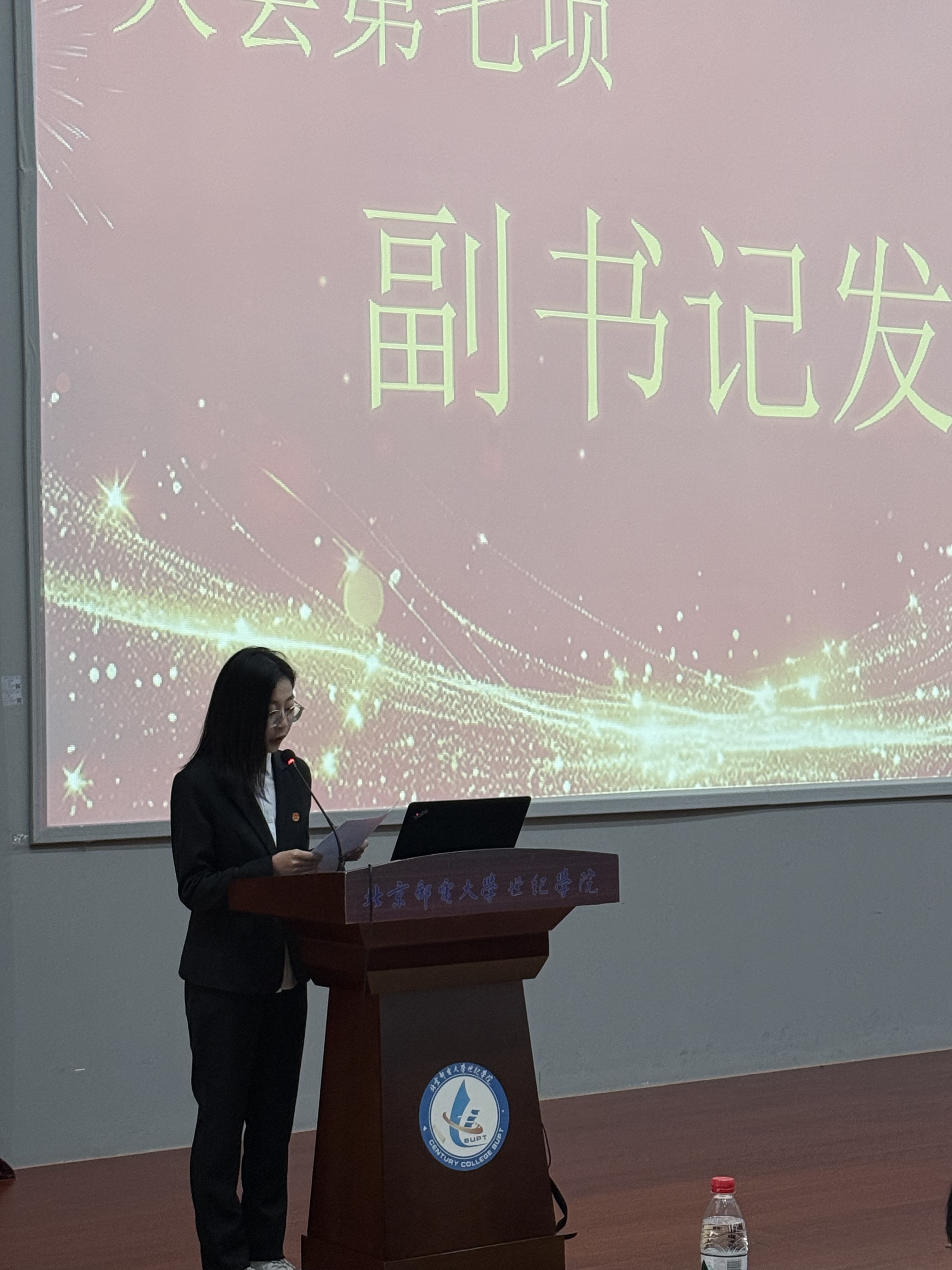 新任团总支副书记戚婷同学,作为代表上台发言,为我们讲述了如何做好工作,提升自己,分享了自己接下来的工作计划和未来展望,向老师和同学们表达了自己的奋进决心。会上,还进行了赠送礼品环节,这是青春的接力棒,是薪火的传承,是崭新篇章的开始。